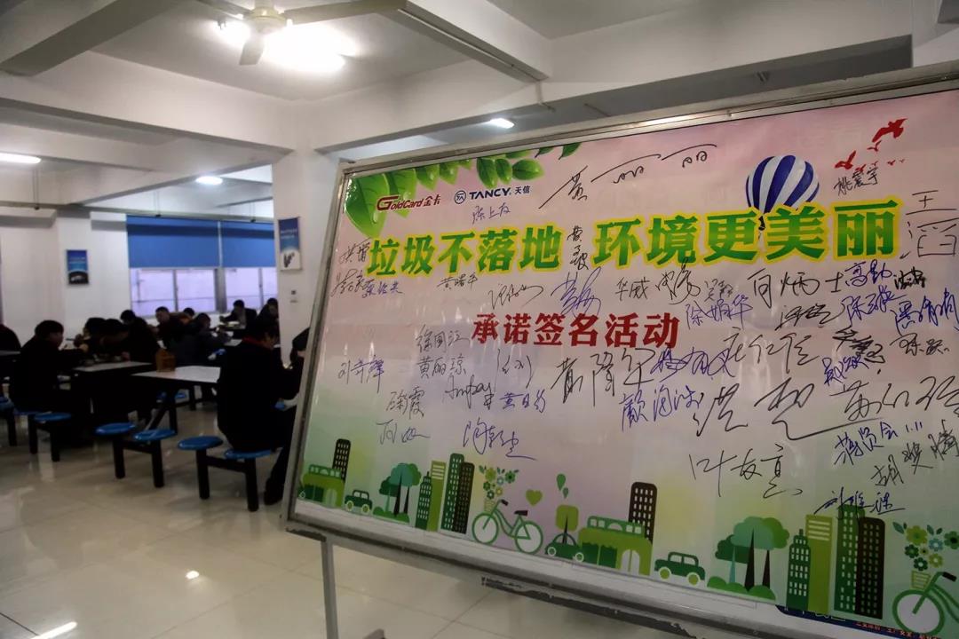 期間,天信黨委還利用午餐員工聚集的時(shí)間,組織員工在食堂進(jìn)行了垃圾不落地、環(huán)境更美麗的全員承諾簽名活動(dòng)。