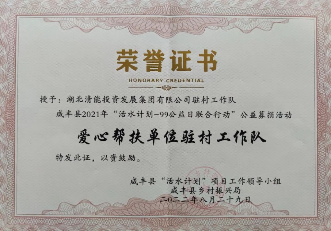 8月29日,清能集團駐村工作隊獲得咸豐縣2021年“活水計劃——99公益日聯(lián)合行動”公益募捐活動“愛心幫扶單位駐村工作隊”榮譽表彰。